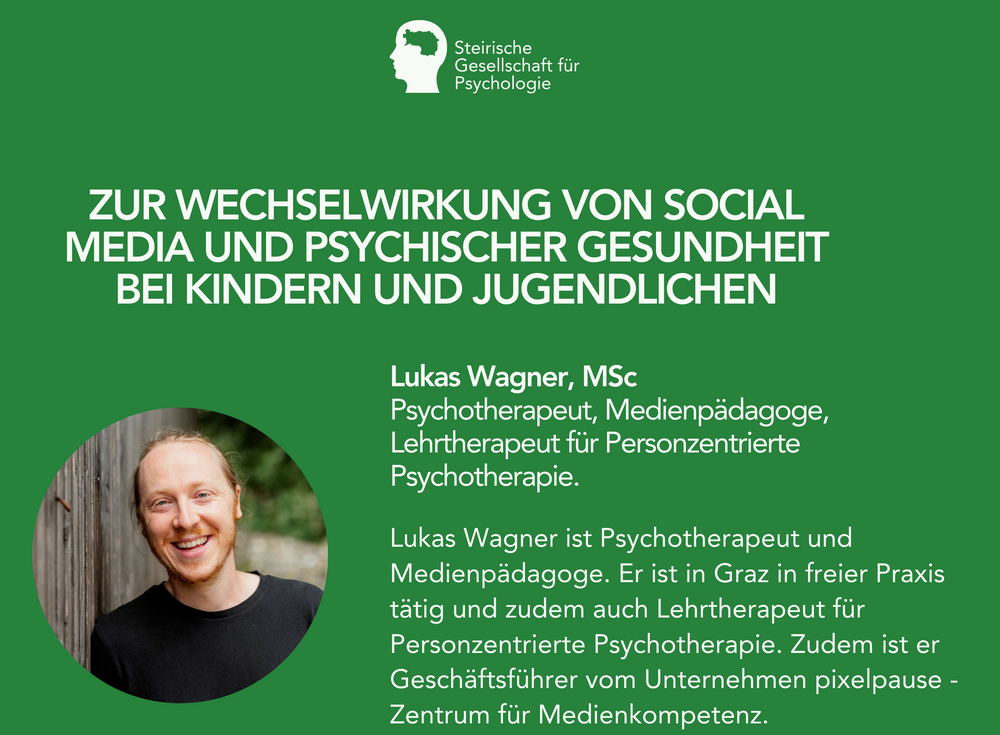 Abstract: Internationale Studien haben zweifelsfrei nachgewiesen, dass es eine komplexe Wechselwirkungen zwischen der Nutzung digitaler Medien, insbesondere Social Media, und der Entstehung und Aufrechterhaltung psychischer Erkrankungen gibt. Dieser Vortrag beschäftigt sich mit den Wirkmechanismen neuer Medien sowie den Zusammenhängen mit psychischer Gesundheit und Krankheit und (intensiver) Mediennutzung durch Kinder und Jugendliche. Dazu werfen wir einen Blick auf das Ausmaß aktueller Mediennutzung, Mechanismen der populären Plattformen und möglichen Interventionsformen.